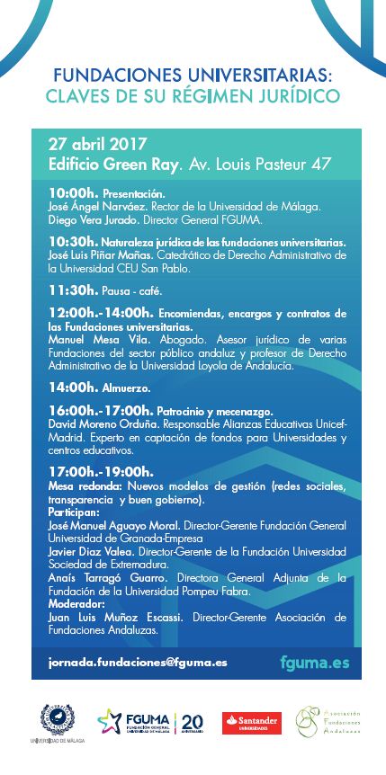 La fundación general de la UMA explica durante esta jornada, las claves de las fundaciones universitarias en cuanto a su régimen jurídico. También hay previsto un coffee breack a las 11:30 en la 4ª planta y un almuerzo a las 14:00 – espacio coworking-.