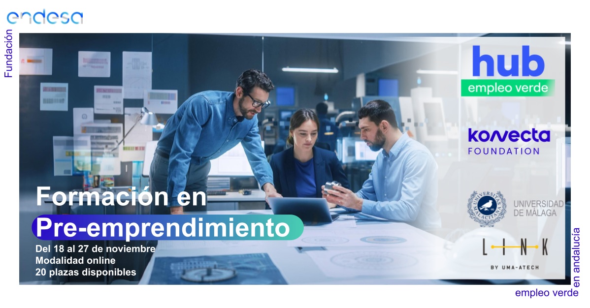 Hub Empleo Verde Andalucía, en colaboración con la Universidad de Málaga a través del Vicerrectorado de Transferencia, Emprendimiento y Empresa, lanza su Formación en Pre-emprendimiento, dirigida a 20 estudiantes con espíritu emprendedor que quieran explorar la posibilidad de crear su propio proyecto en el ámbito de la economía verde y la sostenibilidad, como alternativa al empleo por cuenta ajena.