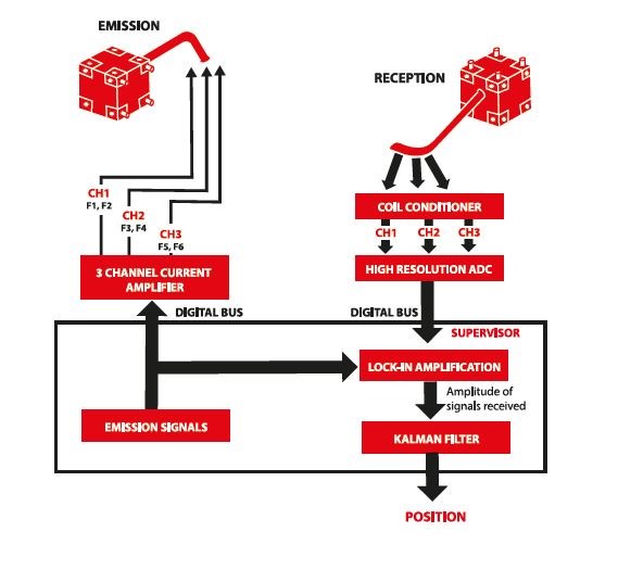 El sistema usa una referencia espacial (el emisor que genera el campo) y los sensores miden ese campo en cada uno de los ejes. La orientación y el movimiento pueden ser conocidos mediante ecuaciones analíticas simples. El resultado de este cálculo es el dato de posición y orientación del sensor, este dato debe enviarse de vuelta al emisor para representar el resultado en pantalla (avatar).