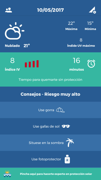 La app muestra el nivel de radiación solar al que estamos expuestos en cada momento. Para ello, analiza la información metereológica del sitio donde estás y calcula en cuanto tiempo se quemará tu piel.